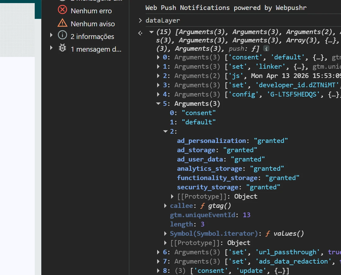 gtag('consent', 'default')eupdate - Validação via dataLayer e debug