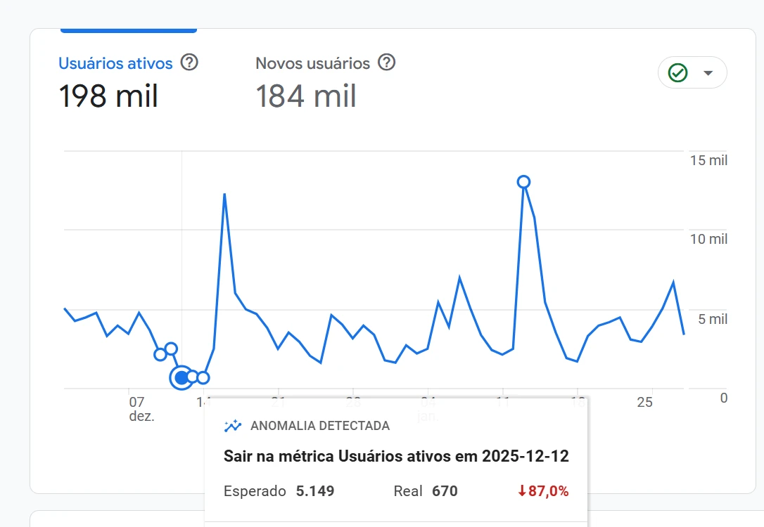 Em dezembro de 2025, identificamos uma queda abrupta na coleta de dados no GA4. Não foi uma queda gradual, foi praticamente um corte seco. Sessões, eventos e conversões simplesmente deixaram de ser registrados de forma consistente.