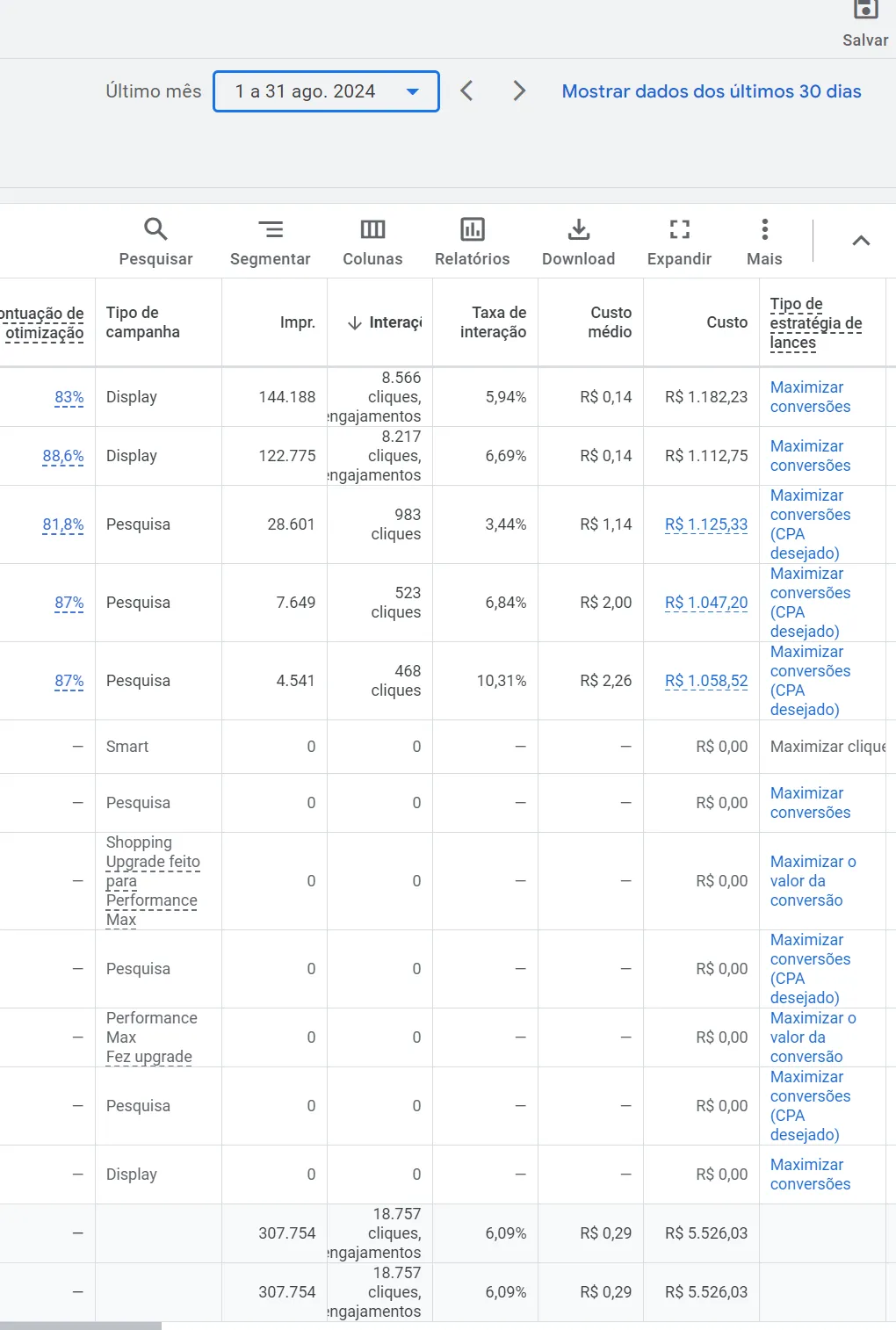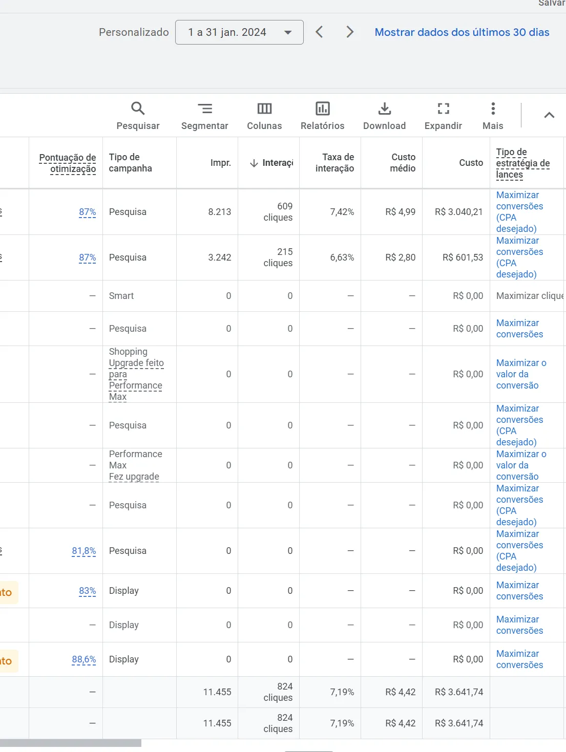 Palavras-chave de marca e não marca foram misturadas nas mesmas campanhas (outra estratégia que eu realmente não gosto).