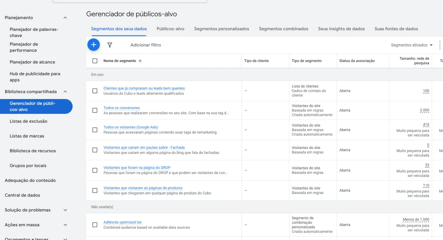 - Gerenciador de públicos alvo no Google Ads